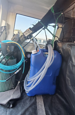 vehicle. The Water Buddy uses a CO2 powered self-priming fluid pump (Flojet) to pull water from a container and push it with force through a 25' 3/8 hose to a regular garden hose connection. You can attach any garden hose type nozzle. |